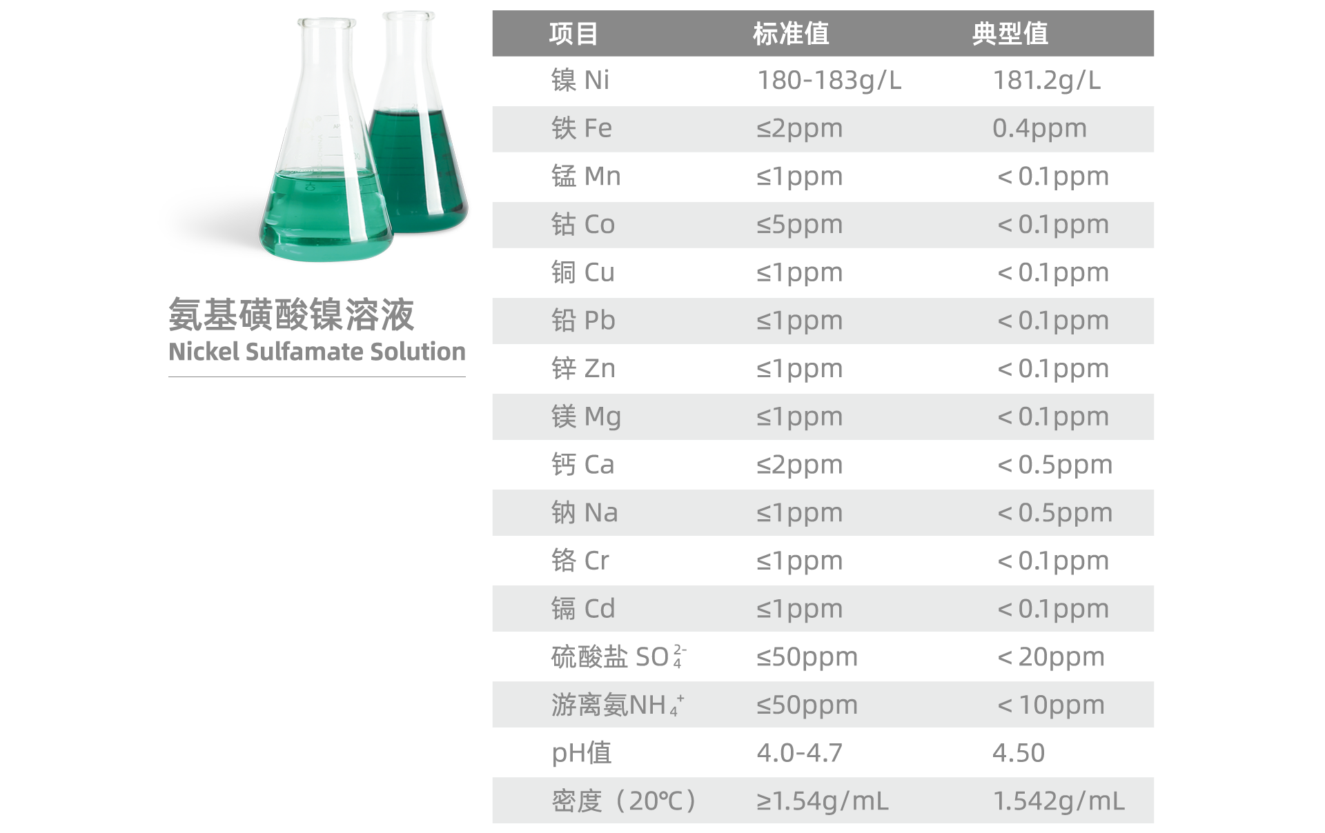 氨基磺酸鎳溶液(Nickel Sulfamate Solution) 分 子式:Ni(NH2SO3)2 分子量:250.87 性 狀:深綠色透明液體。 用 途:主要用于精密電鍍、電鑄、電子工業(yè)等。 包 裝:HDPE桶裝,每桶30公斤。 儲(chǔ) 運(yùn):運(yùn)輸時(shí)包裝要密封,運(yùn)輸過程中防止受熱,貯存在陰涼,通風(fēng)處。